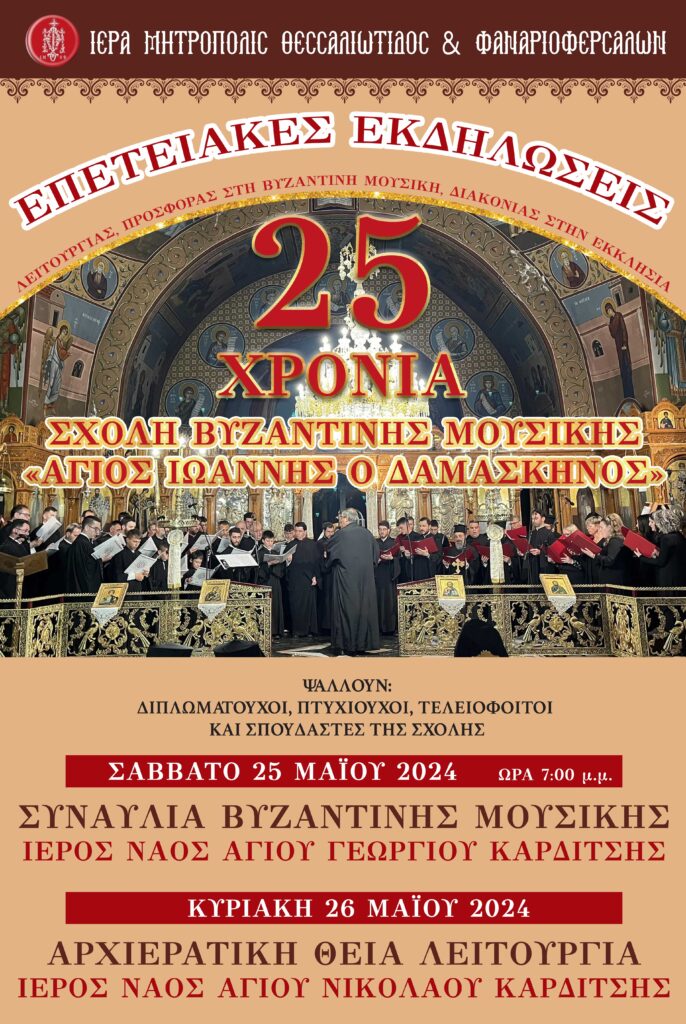 Η Σχολή Βυζαντινής Μουσικής της Ιεράς Μητροπόλεως Θεσσαλιώτιδος «Άγιος Ιωάννης ο Δαμασκηνός» συμπληρώνει εφέτος 25 χρόνια λειτουργίας, προσφοράς στη βυζαντινή μουσική και διακονίας στην Εκκλησία.