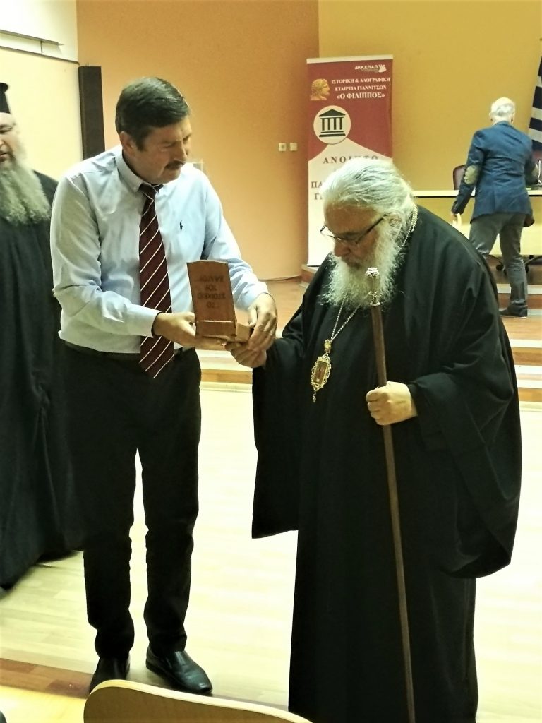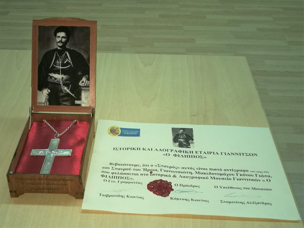 Ακριβές αντίγραφο του τιμίου Σταυρού, τον οποίο έφερε πάντοτε εμφανώς στο στήθος του ο Μακεδονομάχος Γκόνος Γιώτας, επέδωσε στον Σεβασμιώτατο Μητροπολίτη Εδέσσης, Πέλλης και Αλμωπίας κ. Ιωήλ ο Πρόεδρος της Ιστορικής και Λαογραφικής Εταιρίας Γιαννιτσών «Ο Φίλιππος», κ. Κωνσταντίνος Κάμτσης ως ένδειξη τιμής και αναγνώρισης της συνεχούς συμπαραστάσεως και ενισχύσεως του έργου της Εταιρίας αλλά και της ενεργού συμμετοχής του στον αγώνα για τα δίκαια της Μακεδονίας.