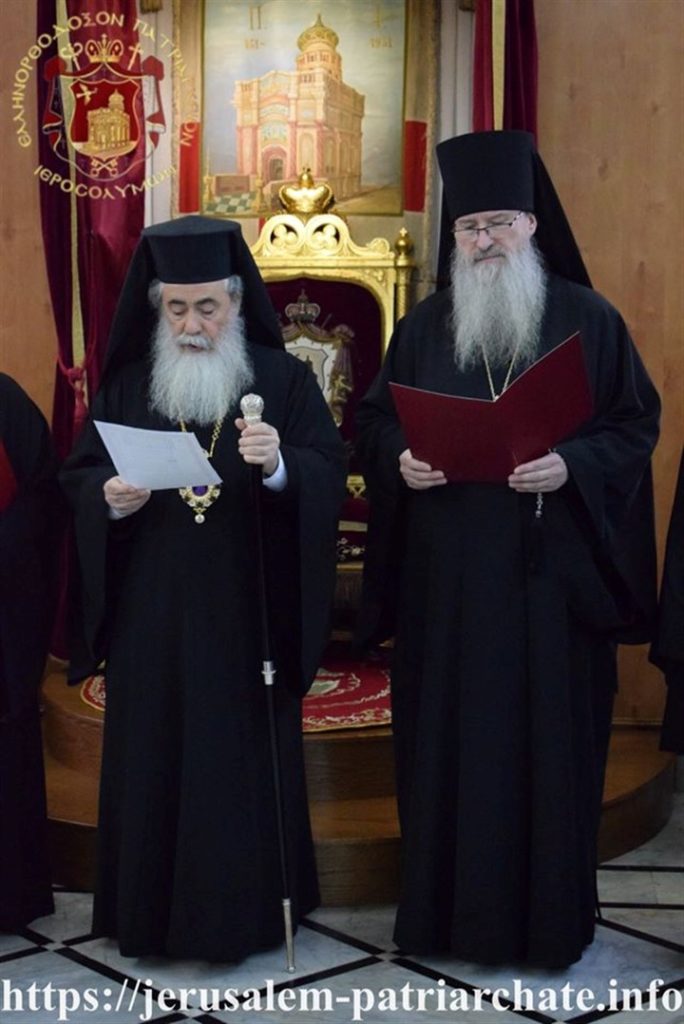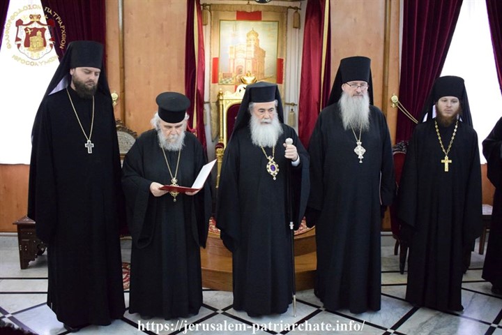 Ἔτι δεόμεθα ὑπέρ ἐλέους, ζωῆς, εἰρήνης, ὑγιείας, σωτηρίας, ἐπισκέψεως, διαφυλάξεως, συγχωρήσεως καί ἀφέσεως τῶν ἁμαρτιῶν τῶν δούλων τοῦ Θεοῦ, πάντων τῶν εὐσεβῶν καί Ὀρθοδόξων Χριστιανῶν, Προσκυνητῶν, Ἐπιτρόπων τε καί Συνδρομητῶν τοῦ Παναγίου καί Ζωοδόχου Τάφου καί πάντων τῶν κατοικούντων καί παρεπιδημούντων ἐν τῇ Ἁγίᾳ Πόλει Ἱερουσαλήμ, ὑγιείας καί σωτηρίας ὑπέρ αὐτῶν εἴπωμεν.