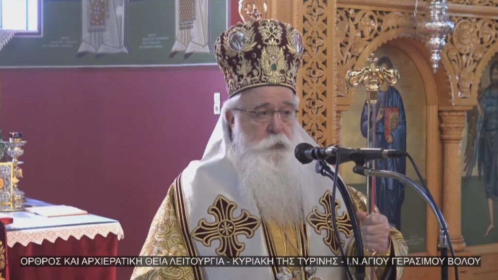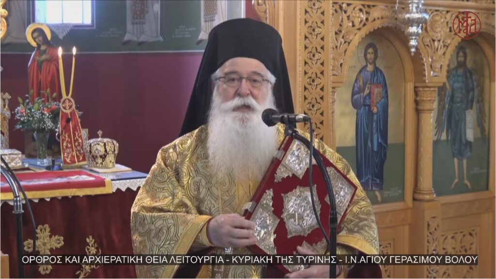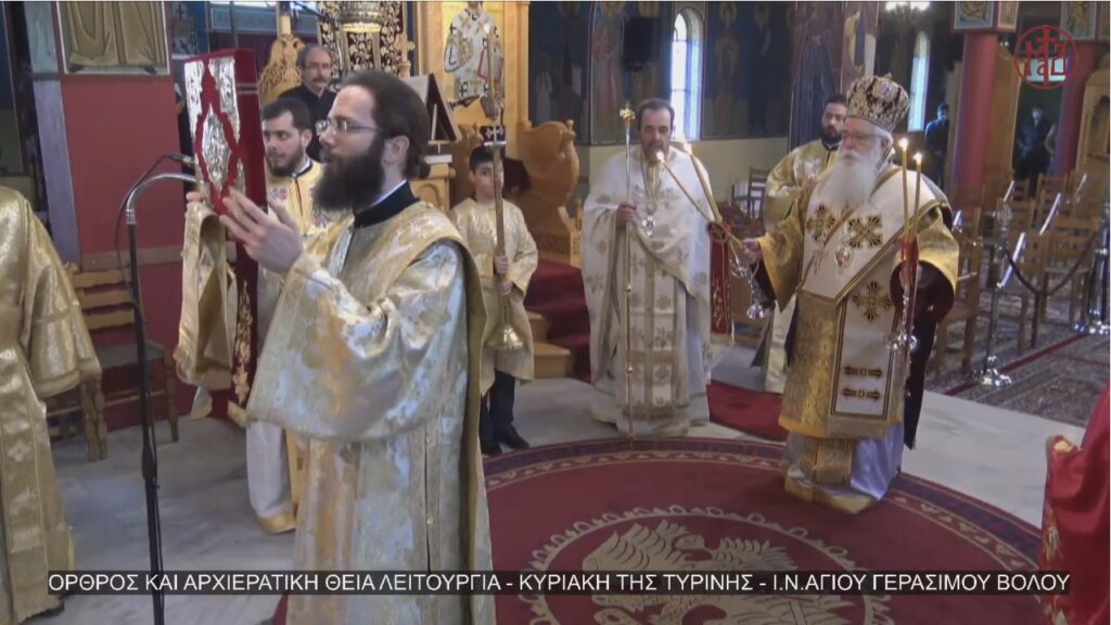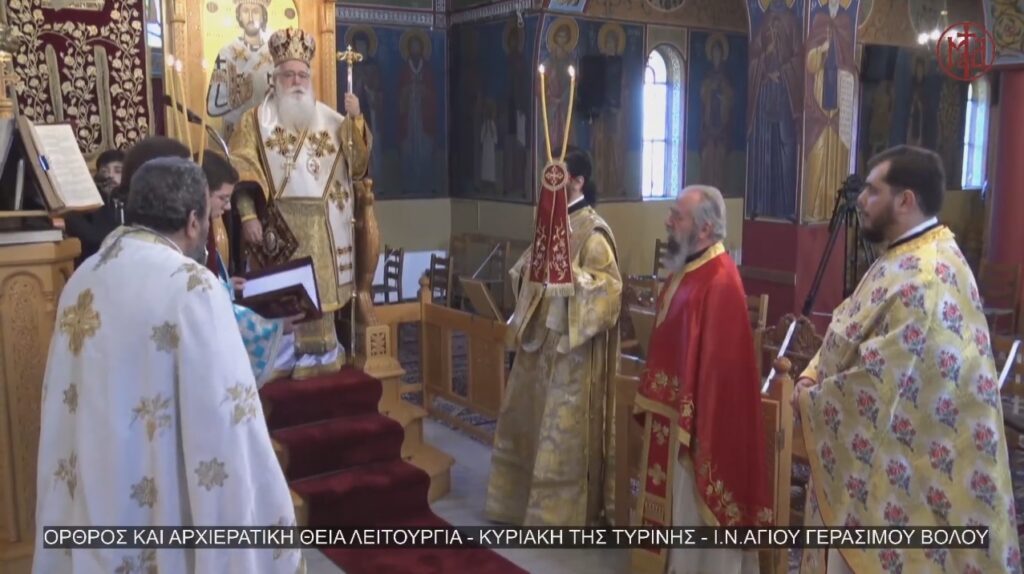 Στον Ιερό Ναό Αγίου Γερασίμου Βόλου λειτούργησε σήμερα, Κυριακή της Τυρινής, ο Σεβ. Μητροπολίτης Δημητριάδος κ. Ιγνάτιος, κεκλεισμένων των θυρών, λόγω των μέτρων για την προστασία της δημόσιας υγείας.