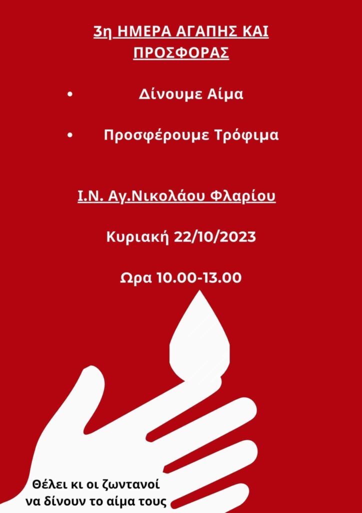 Είναι γεγονός πως σε κάθε υγειονομική κρίση το πρώτο πράγμα που μπορούμε να προσφέρουμε είναι το αίμα μας για να σωθεί ένας συνάνθρωπός μας Επειδή όμως οι ανάγκες για αίμα είναι καθημερινές, για τον λόγο αυτό, ο Ενοριακός Ιερός Ναός Αγίου Νικολάου (Φλαρίου) Καλαμάτας, σε συνεργασία με φίλους και εθελοντές του Ναού, διοργανώνει την Κυριακή 22 Οκτωβρίου 2023, την 3η Ημέρα Αγάπης και Προσφοράς. Στα πλαίσια αυτής της διοργάνωσης θα πραγματοποιηθεί Εθελοντική Αιμοδοσία στον αύλειο χώρο του Ναού και σε ειδικά διαμορφωμένο χώρο και από ώρας 10:00 π.μ. έως 13:00 μ.μ.