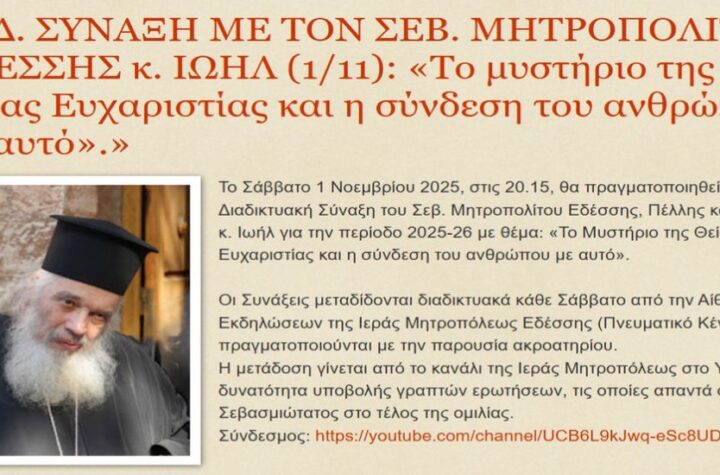 Το Σάββατο 1 Νοεμβρίου 2025, στις 20.15, θα πραγματοποιηθεί η 1η Διαδικτυακή Σύναξη του...