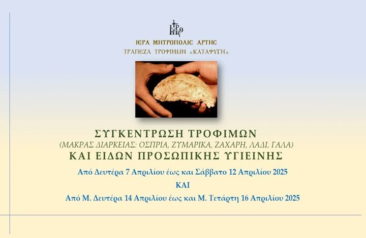 Ἡ Ἱερὰ Μητρόπολις Ἄρτης λειτουργεῖ τὴν Τράπεζα Τροφίμων «ΚΑΤΑΦΥΓΗ», μέσω τῆς ὁποίας δίνεται ἡ δυνατότητα...
