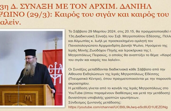 Το Σάββατο 29 Μαρτίου 2024, στις 20.15, θα πραγματοποιηθεί η 13η Διαδικτυακή Σύναξη του...