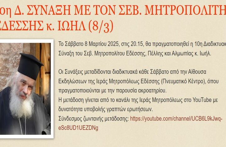 Το Σάββατο 8 Μαρτίου 2025, στις 20.15, θα πραγματοποιηθεί η 10η Διαδικτυακή Σύναξη του...