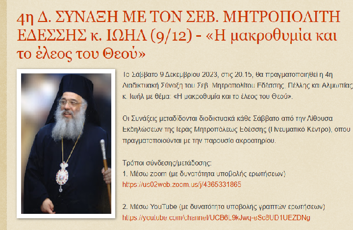 Το Σάββατο 9 Δεκεμβρίου 2023, στις 20.15, θα πραγματοποιηθεί η 4η Διαδικτυακή Σύναξη του...