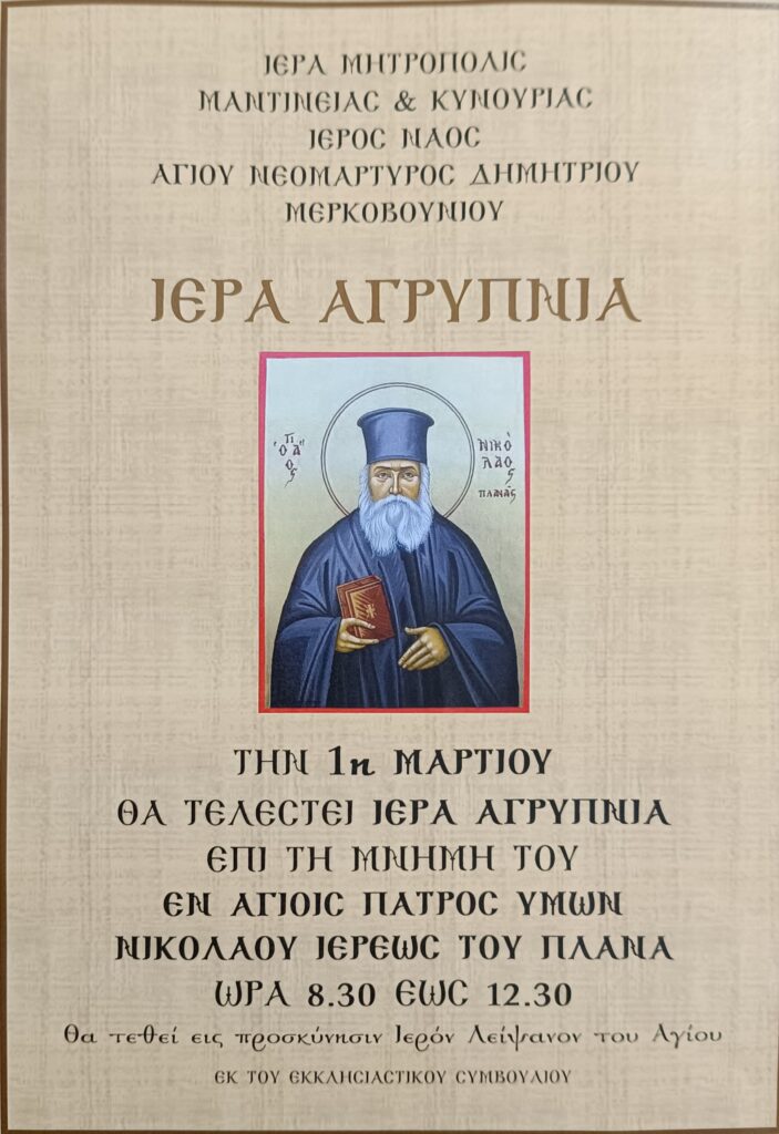 Την Παρασκευή 1 Μαρτίου 2023 ώρα 20:30- 12:30, στον Ιερό Ναό Αγίου Νεομάρτυρος Δημητρίου Μερκοβουνίου, θα τελεσθεί ιερά Αγρυπνία επί τη μνήμη του Αγίου Ιερέως Νικολάου του Πλανά.