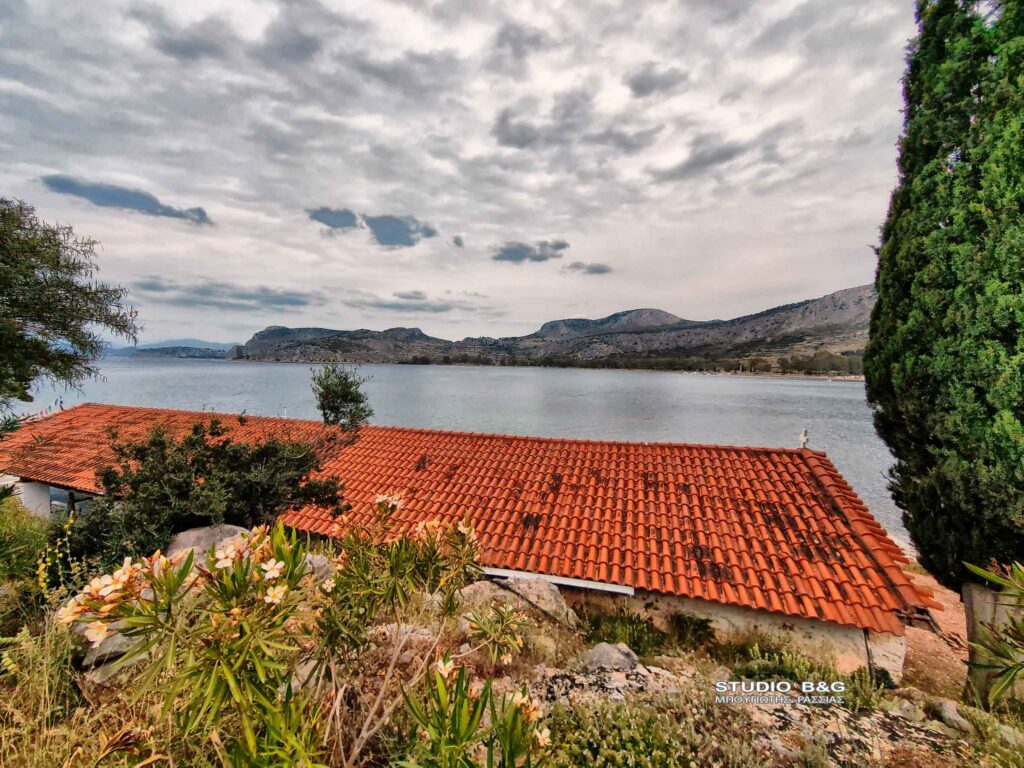 Ένα λευκό διώροφο σπίτι – ξενώνας με χαγιάτι υψώνεται λίγα μέτρα πιο πάνω, ανοιχτόκαρδο. Δίπλα στο ιερό – μινιατούρα, ένα ψηλόκορμο κυπαρίσσι. Δυο φουντωμένοι ευκάλυπτοι μαλακώνουν το φόντο της γυμνής ράχης, πίσω. Πιο μακριά, το εκκλησάκι του Άη Νικόλα.